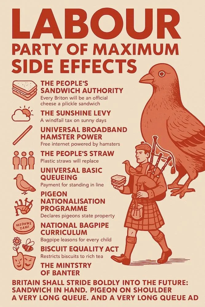We shall end the chaos of culinary choice by nationalizing the sandwich. Citizens will proudly eat the Official Cheese & Pickle Sandwich™, subject to a fair and transparent three-week queueing system. Alternative fillings will be classified as discriminatory and colonialism-inspired.
